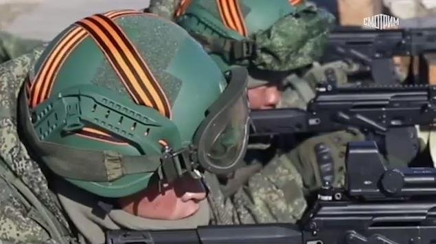 영상에서 북한군의 헬멧에 러시아군의 승리를 상징하는 게오르기 리본(게오르기옙스카야 렌토치카)이 십자 모양으로 부착돼 눈길을 끌었다.