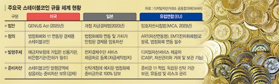 EU도 스테이블코인을 자산연동형(ART), 전자화폐형(EMT)으로 분류하고 각각에 맞는 규제를 적용하고 있다. 복수통화나 실물자산에 연계된 스테이블코인인 ART는 금융안정성 차원에서 유럽은행감독청의 승인 의무와 같은 엄격한 감독의무를 부여하고 있다. 또 단일 법정통화에 연계된 스테이블코인인 EMT는 전자화폐 규제 프레임워크에 통합하는 방식이다.