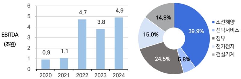 2021년 1조원 가까운 손실에서 2조원에 육박한 이익을 내는 구조로 '환골탈태(換骨奪胎)'라고 해도 과언이 아니다. 2024년 기준 그룹 EBITDA에서 차지하는 비중도 39.9%에 달했다. 전세계 군비 경쟁과 미국 조선업 부흥 정책의 수혜를 보고 있는데, 성장은 현재 진행형이다.