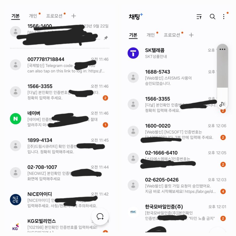 이어 인증 번호 메시지로 가득 찬 문자메시지 창 사진 여러 장을 첨부했다.
