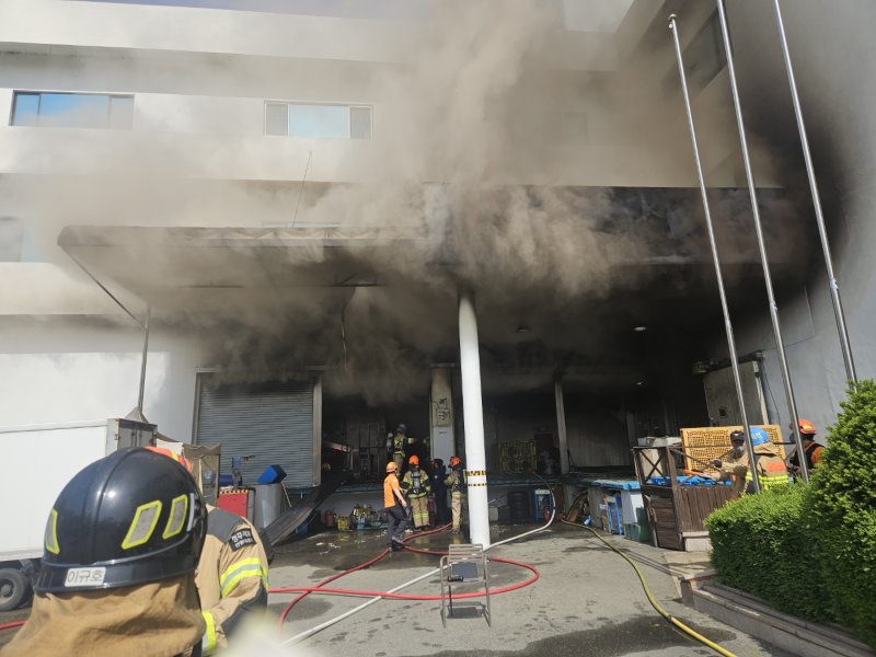 [청주=뉴시스] 서주영 기자 = 30일 오전 9시께 충북 청주시 흥덕구 강서동의 한 농임산물 업체 냉동창고에서 불이 났다.