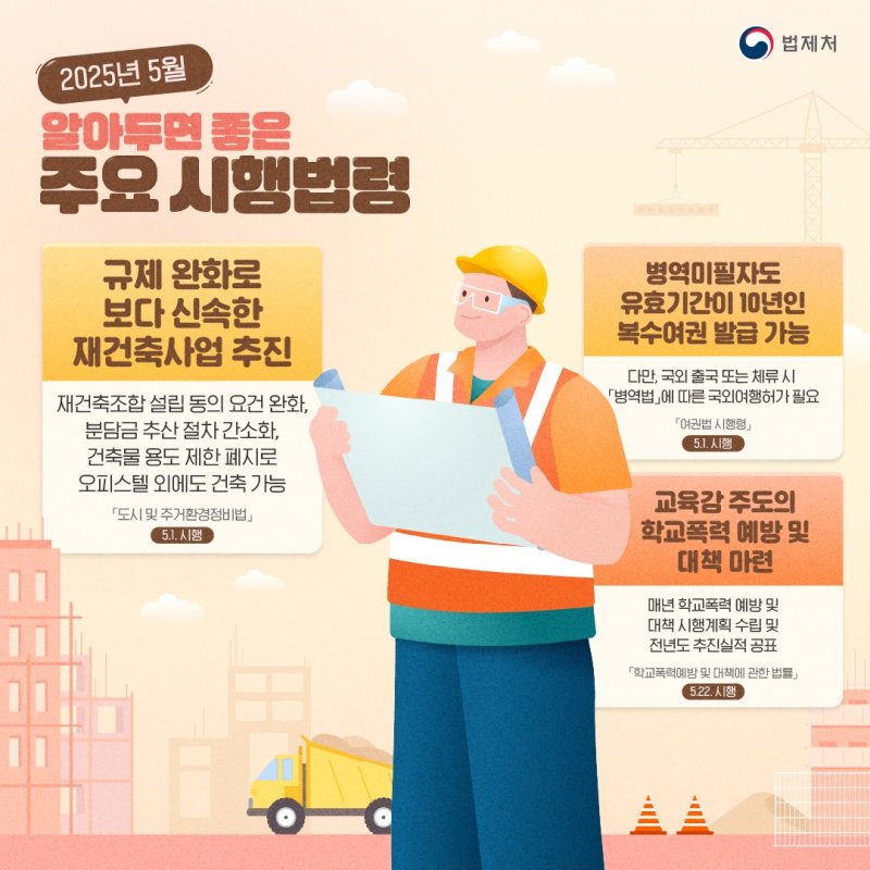 (서울=뉴스1) 이기림 기자 = 5월부터는 신속한 재건축사업 추진을 위해 재건축조합을 설립할 때 필요한 동의 요건이 완화된다. 병역미필자도 유효기간이 10년인 여권을 발급받을 수 있다.