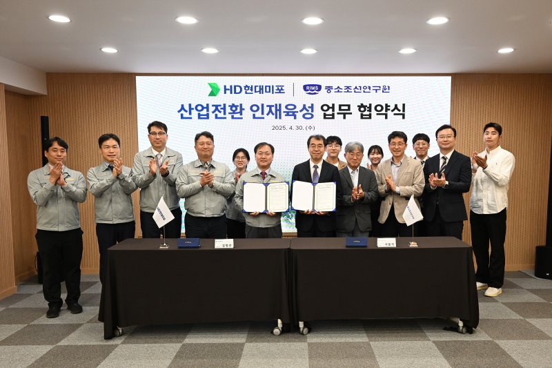 HD현대미포는 30일 울산 본사에서 김형관 사장과 서용석 중소조선연구원장 등이 참석한 가운데 중소조선연구원과 친환경 선박 분야 산업전환 인재 육성을 위한 업무협약(MOU)을 체결했다고 밝혔다.