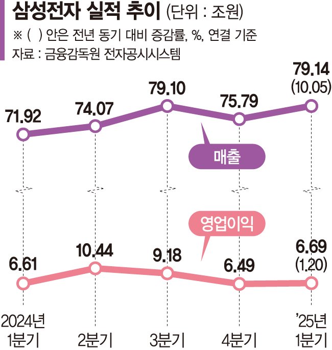 삼성전자는 1·4분기 반도체 바닥론을 기반으로, 하반기부터는 본격적인 반등에 나설 계획이다. 삼성전자의 반도체 사업을 담당하는 디바이스솔루션(DS)부문의 올 1·4분기 매출은 25조1000억원이며, 영업이익은 간신히 1조원을 넘긴 1조1000억원(전년 동기 대비 8000억원 감소)을 기록했다. 이를 포함한 삼성전자의 올해 1·4분기 전체 확정 실적은 매출 79조1405억원(전년 동기 대비 10.05% 증가), 영업이익 6조6853억원(1.2% 증가)이다. 매출 실적 자체는 역대 분기 최대 실적이다. 갤럭시 S25 출시 효과에 따른 것으로, 스마트폰을 필두로 한 디바이스경험(DX)부문이 전체 영업이익의 70%(4조7000억원)를 차지하며, 반도체 실적 부진에도 '버팀목' 역할을 해냈다. 이 가운데 '매출실적 1등 공신'인 MX사업부의 영업이익은 4조3000억원으로, 반도체 사업을 담당하는 DS부문의 약 4배를 기록했다. MX사업부는 2·4분기 슬림형 플래그십 스마트폰 '갤럭시 S25 엣지'와 폴더블 '갤럭시Z' 신제품 출시로 판매 행진을 이어간다는 구상이다. 갤럭시 S25 엣지는 5월 중순 공개 후 글로벌 주요 국가에서 판매에 돌입할 예정이다.