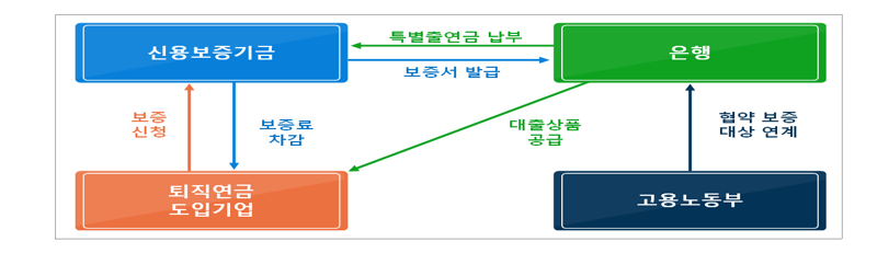 고용노동부는 퇴직연금을 새롭게 도입한 중소기업을 협약보증 대상으로 은행에 연계하고, 신용보증기금은 해당 기업에 보증서 발급 및 우대보증을 공급한다. 10개 은행은 대출상품을 공급하고 우대 금리를 적용함으로써 중소기업이 퇴직연금을 도입하더라도 당장의 경영자금 부족 문제를 최소화할 수 있도록 지원한다.