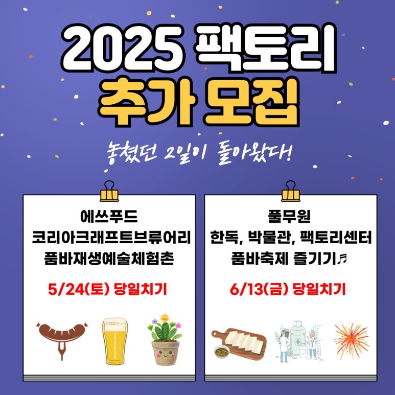 24일에는 에쓰푸드(소시지 만들기), 코리아크래프트브류어리(수제맥주 시음), 품바재생예술체험촌 등을 체험한다.
