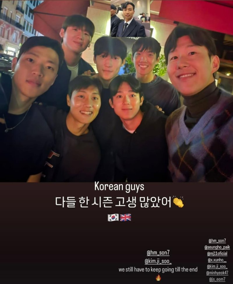 사진에 모인 선수 가운데 프리미어리그에서 뛰는 황희찬, 손흥민, 김지수 등 3명은 아직 시즌을 마무리하지 않은 가운데 나머지 5명은 모든 일정을 마무리했다.