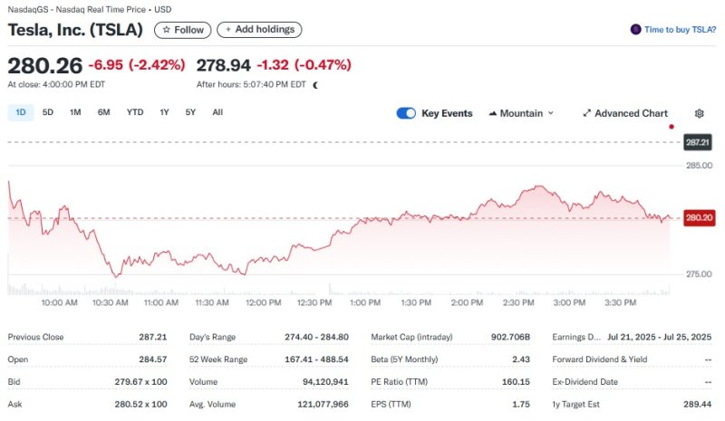 5일(현지시간) 뉴욕증시에서 테슬라는 2.42% 급락한 280.26달러를 기록했다.