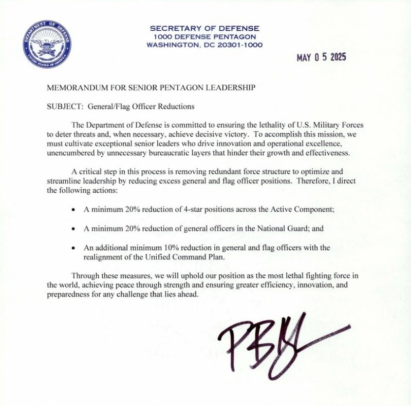 헤그세스는 각서에서 △현역 부대 내 4성 장성 직위 최소 20% 감축 △주 방위군 내 장성 직위 20% 감축 △통합 지휘 계획 재편과 연계한 장성 및 장교 직위 추가로 최소 10% 감축 등을 지시했다.
