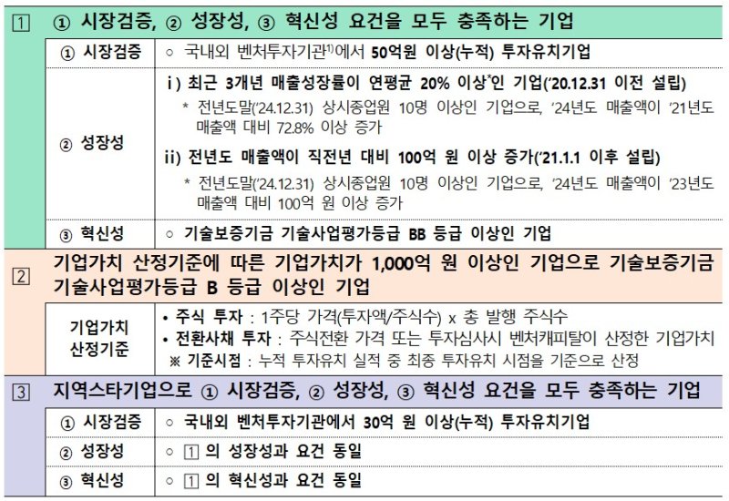 예비유니콘 특별보증은 누적 투자실적이 50억원 이상(지역스타기업 30억원)이고 성장성, 혁신성 요건을 충족하거나, 기업가치 1000억원 이상인 기업이 지원 가능하다.