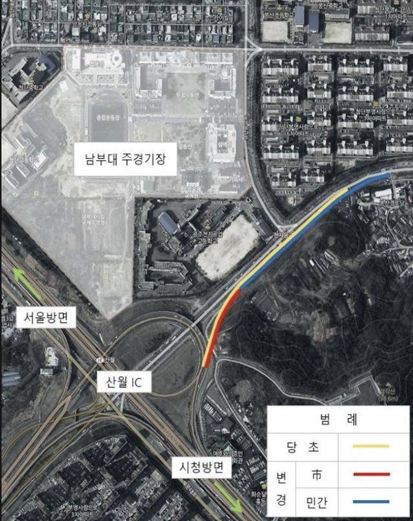 기존에 공사가 진행된 260m 구간(1구간, 국·시비 33억 원)은 광주시가, 남은 497.6m(2구간, 민간 120억 원)는 민간공원 사업자가 시공하는 것으로 구간을 분리했고 아파트 주 진입로 부분은 지하차도(210m)를 만들도록 설계했다.