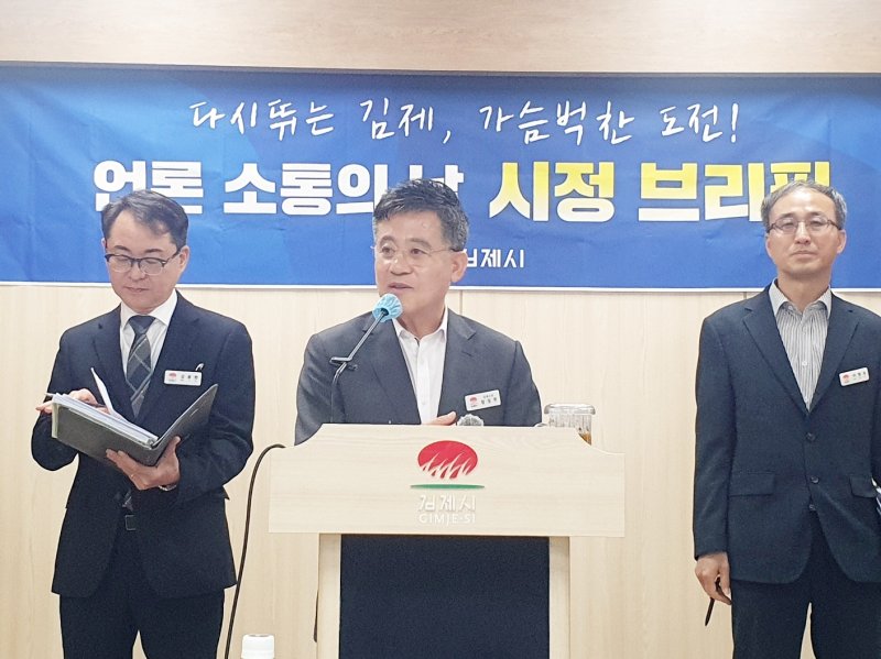 [김제=뉴시스]고석중 기자 = 전북특별자치도 정성주 김제시장이 7일 기자간담회에서 "해양수산부가 중앙항만정책심의회를 통해 새만금항 신항 지정안을 의결했다"면서 이는 "김제시의 항만권 독립 요구가 일정 부분 받아들여진 결과"라고 주장했다.