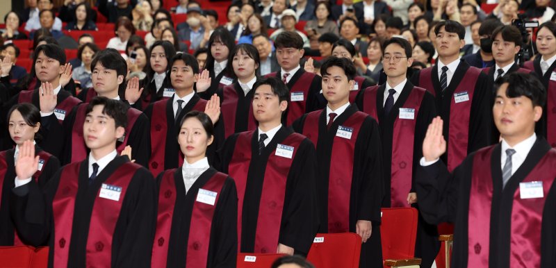[과천=뉴시스] 이영환 기자 = 7일 오후 경기 과천시 법무부에서 열린 신임검사 임관식에서 신임 검사들이 선서를 하고 있다. 2025.05.07. 20hwan@newsis.com [서울=뉴시스] 류현주 기자 = 법무부는 7일 법학전문대학원 출신 제14회 변호사시험 합격자 90명을 검사로 신규 임용하며 임관식을 거행했다.