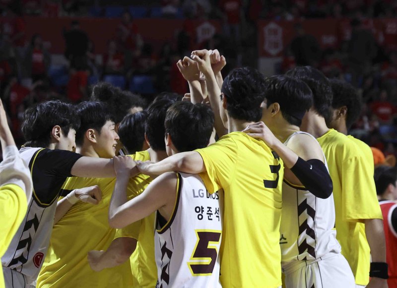 [서울=뉴시스] 김근수 기자 = 7일 잠실학생체육관에서 열린 2024-2025 KBL 챔피언결정전 2차전 창원 LG 대 서울 SK 경기에서 창원 LG가 76-71로 승리를 거두고 선수들이 기뻐하고 있다. 2025.05.07. ks@newsis.com [서울=뉴시스]홍효식 하근수 김근수 기자 = 프로농구 창원 LG가 서울 SK를 꺾고 챔피언결정전 우승 확률을 끌어올렸다.
