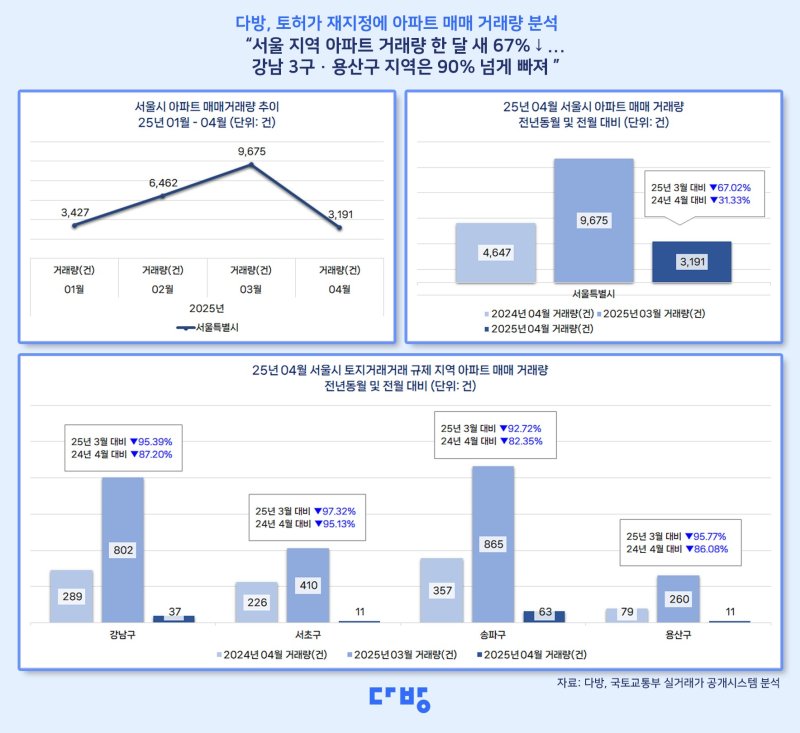 다방 관계자는 "토지거래허가구역 해제 이후 일시적으로 회복세를 보였던 서울 아파트 거래량이 재지정 발표와 함께 매수 심리가 위축되며 빠르게 급감한 상황"이라며 "거래 제한이 강화된 지역을 중심으로 관망하는 분위기가 확산되면서 거래량이 다시 회복되기까지는 다소 시간이 걸릴 것으로 보인다"고 전했다.