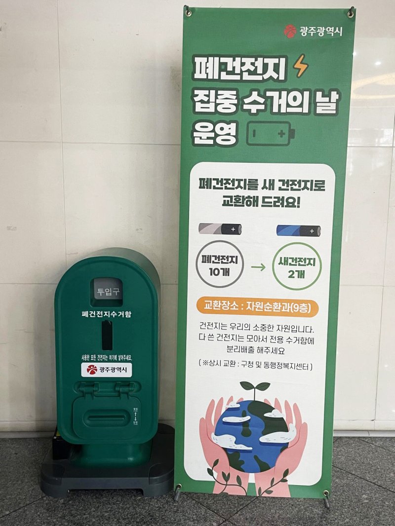 집중 수거 기간 시민이 폐건전지 10개를 가져오면 새건전지 2개로 교환해 준다. 교환 장소는 광주시 자원순환과, 5개 자치구 청소행정과, 가까운 동 행정복지센터다.