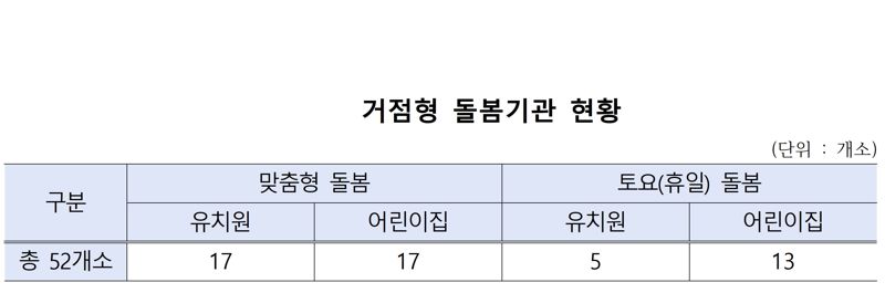 해당 지역은 서울, 부산, 광주, 대전, 울산, 경기, 충남, 전북, 경북, 경남, 제주 등 11곳이며, 어린이집 30개, 유치원 22개 등 총 52곳을 거점형 돌봄기관으로 지정했다.