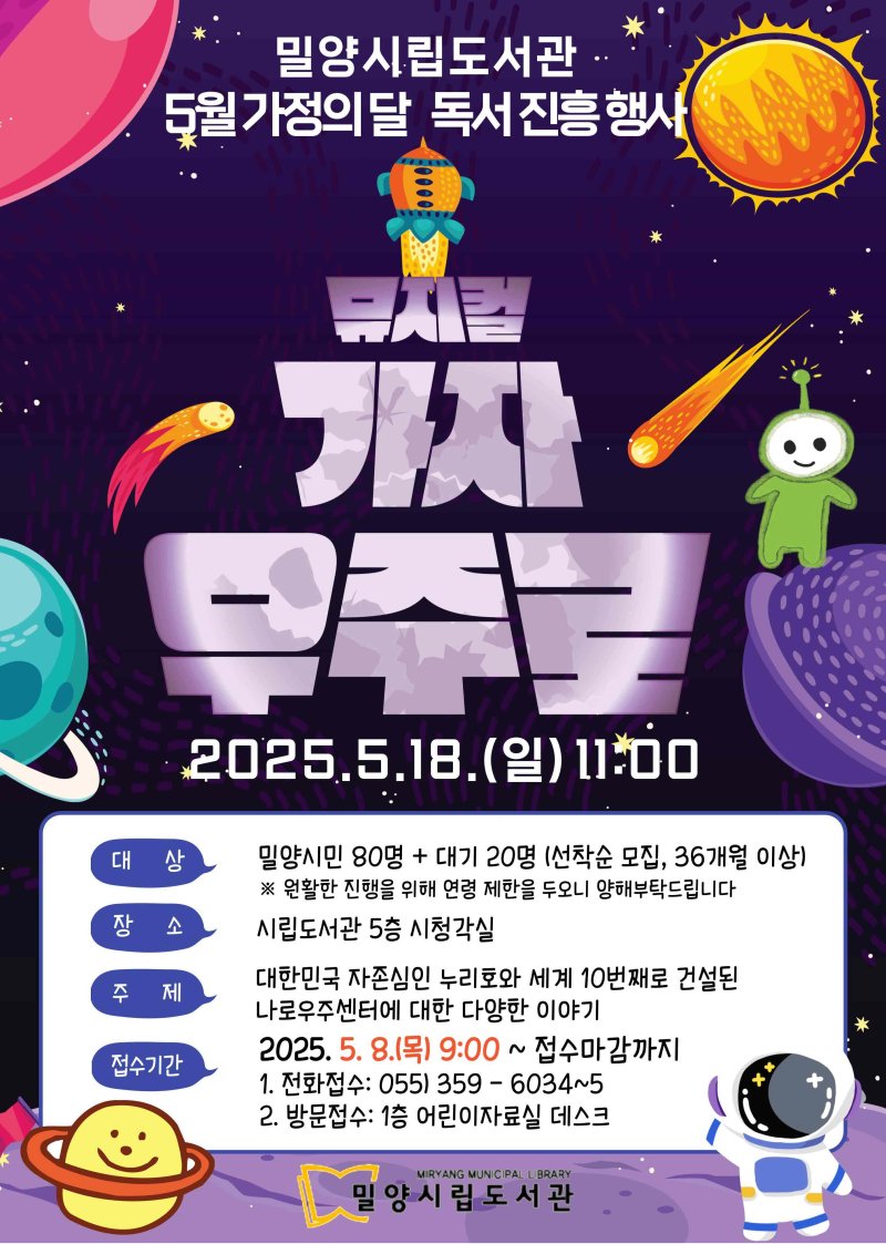 [밀양=뉴시스] 안지율 기자 = 경남 밀양시는 가정의 달 5월을 맞아 온 가족이 함께 즐길 수 있는 독서 진흥 행사로 어린이 뮤지컬 '가자! 우주로' 공연을 개최한다고 8일 밝혔다.