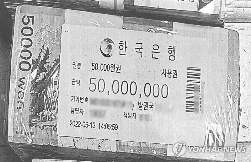 이 신권은 한은이 적힌 비닐로 포장돼 있고, 비닐에는 기기번호, 담당자, 책임자, 일련번호와 함께 윤석열 전 대통령 취임 3일 후인 2022년 5월 13일이란 날짜가 찍혀있다.
