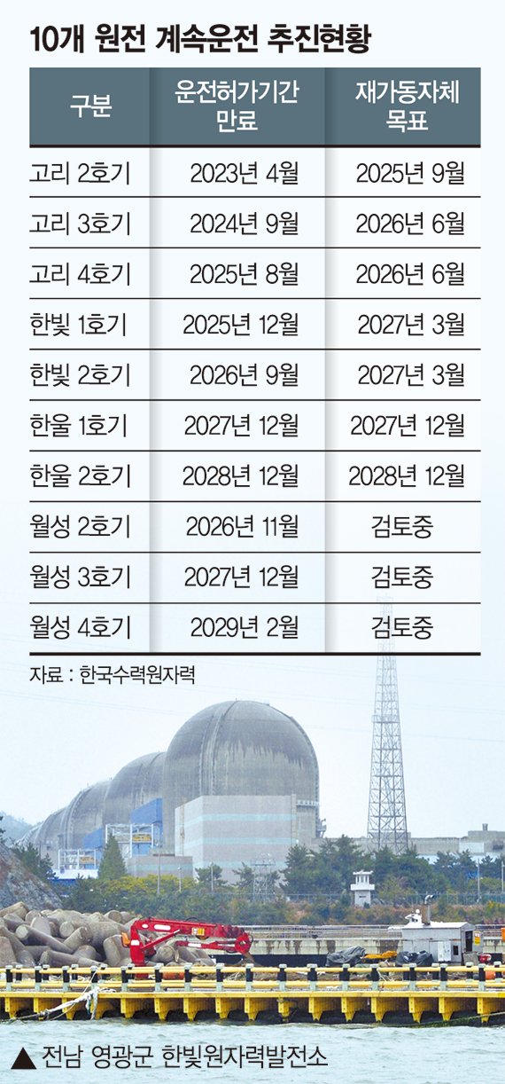 우리나라는 설계수명 종료로 가동이 중지된 원전이 2기이며, 2029년까지 종료될 예정인 원전은 8기다. 지난해 11월 대통령실은 "허가 수명이 다한 원전도 최대 20년까지 연장해 사용할 수 있도록 관련 제도를 바꾸겠다"고 밝혔다. 정부는 고리 2·3·4호기, 한울 1·2호기, 한빛 1·2호기, 월성 2·3·4호기 등 노후 원전을 대상으로 계속운전 절차를 밟으며 수명 연장에 나선 것이다.