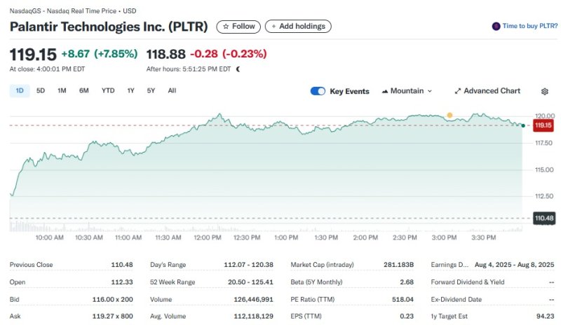 8일(현지시간) 뉴욕증시에서 팔란티어는 7.85% 급등한 119.15달러를 기록했다. 이로써 팔란티어의 시총은 2811억달러로 집계됐다.