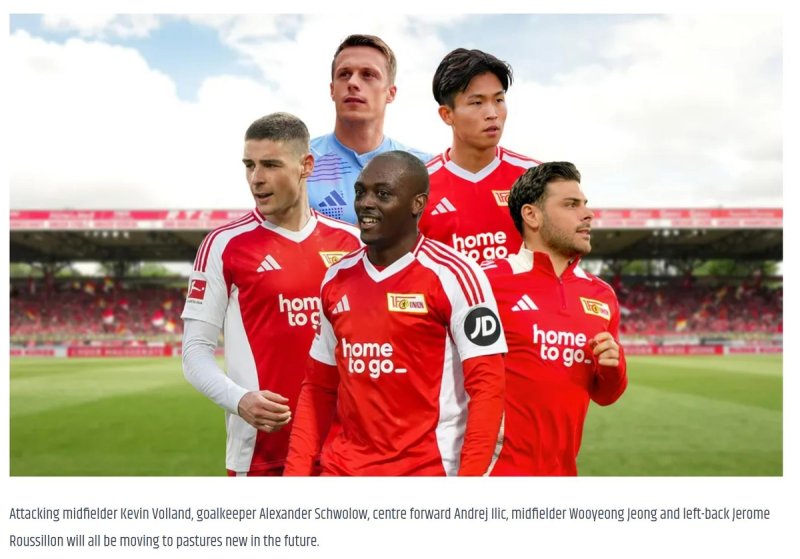 우니온 베를린은 10일(한국시간) 홈페이지를 통해 "시즌 종료가 가까워지면서 팀과 작별 인사를 해야 할 시간이 왔다. 1군 팀에서 활약한 5명의 선수가 이번 여름 팀을 떠나게 됐다"라고 발표했다.