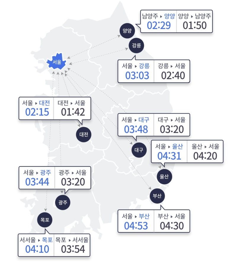 같은 시각 지방 도시에서 서울까지는 △부산 4시간 30분 △울산 4시간 20분 △강릉 2시간 40분 △양양 1시간 50분(남양주 도착) △대전 1시간 42분 △광주 3시간 20분 △목포 3시간 54분(서서울 도착) △대구 3시간 20분이다.