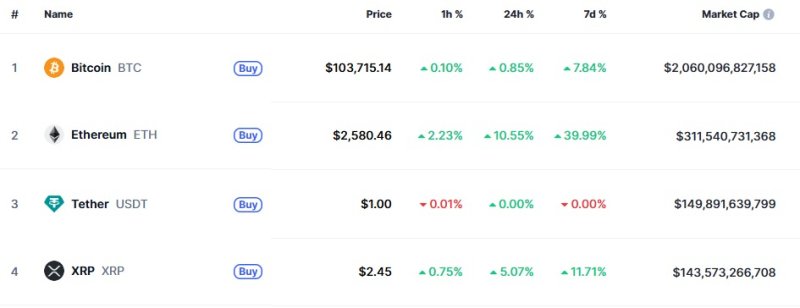 11일 오전 9시 현재 글로벌 코인 시황 중계사이트인 코인마켓캡에서 시총 2위 이더리움은 10.55% 폭등한 2580달러에 거래되고 있다. 이로써 이더리움은 지난 1주일간 40% 폭등했다.