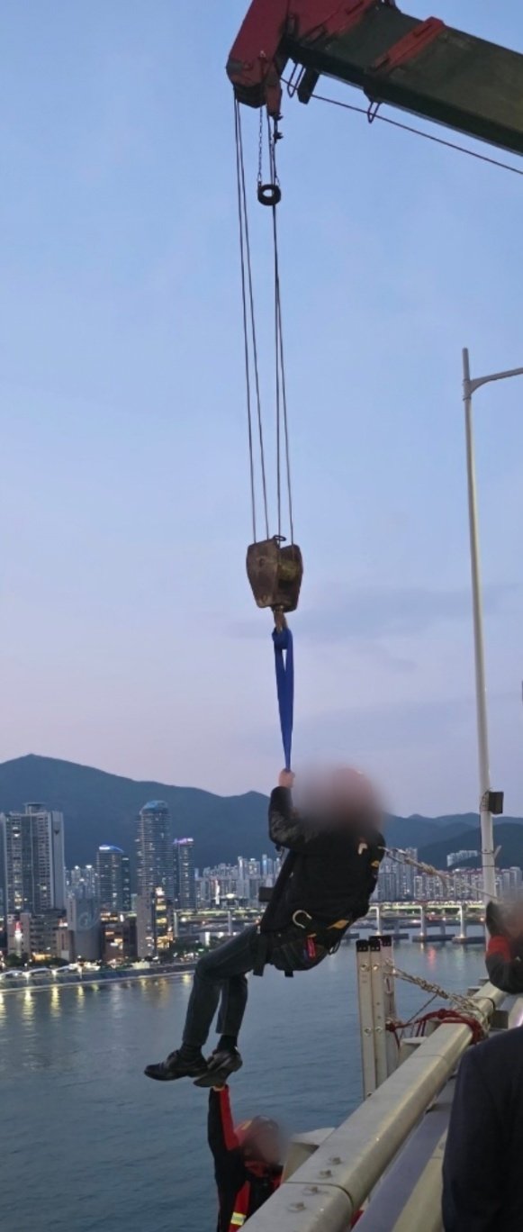 (부산=뉴스1) 손연우 기자 = 11일 광안대교에서 고공 농성을 벌인 형제복지원 피해자가 8시간 만에 내려왔다.