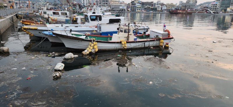 지난 11일 오후 통영시 중앙동·동호동 연안인 강구안에는 둥둥 떠다니는 해상 쓰레기와 육지에서 흘러든 오염물질로 뒤덮였다.