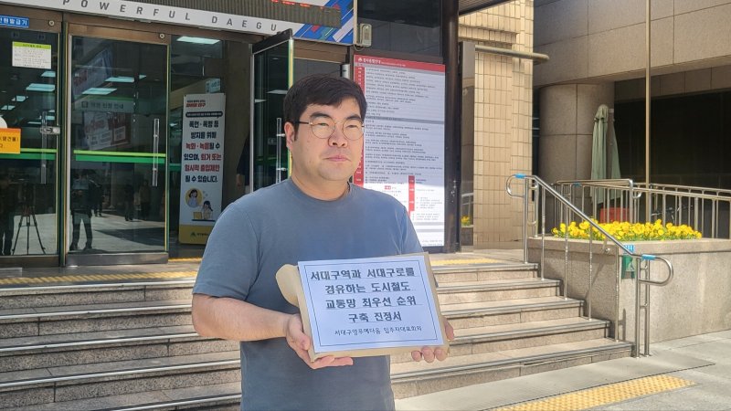 (대구=뉴스1) 이성덕 기자 = 대구 서구 주민들이 12일 오전 10시30분 대구시청 동인청사에 찾아 서대구역과 서대구로를 경유하는 도시철도 교통망 구축을 촉구하는 진정서를 제출했다.