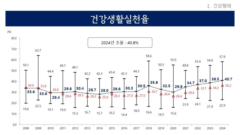 먼저 금연, 절주, 걷기 모두를 실천한 복합지표인 '건강생활실천율'은 전국 중앙값 36.2%보다 4.5% 높은 40.7%로 나타났다. 이는 지역사회건강조사를 실시한 2008년 이후 역대 최고치다.