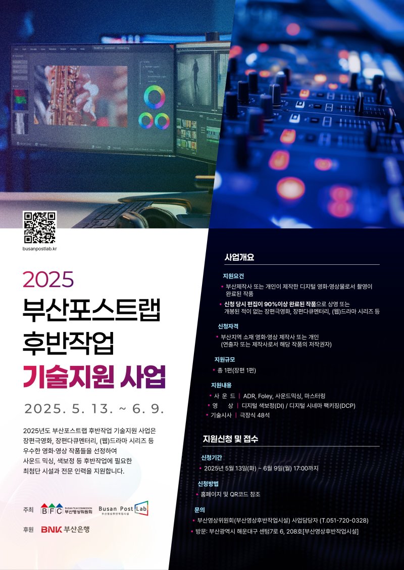 이 사업은 지역에서 제작된 영화·영상 콘텐츠의 완성도와 경쟁력을 높이기 위해 부산영상후반작업시설의 전문 장비와 인력을 활용하여 후반작업을 지원해주는 것이다.