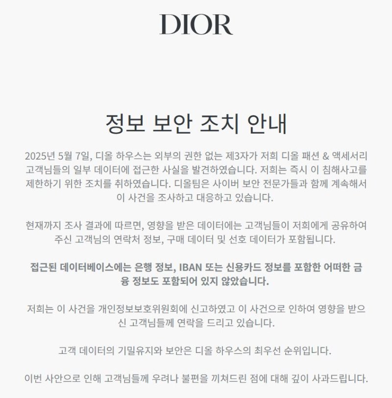 다만 고객의 은행 정보, IBAN 또는 신용카드 정보를 포함한 금융 정보는 포함되지 않았다고 디올 측은 설명했다.