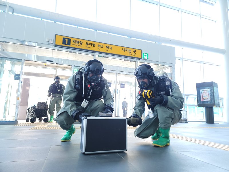 지난 12일 정선군 사북종합운동장에 이은 이날 '지상협동훈련'에는 36사단 화생방테러특수임무대(CRST)와 위험성 폭발물 개척팀(EHCT), 평창대대, 평창군청·경찰서·소방서·보건소·한국철도공사, 한국 드론기술원 관계자 120여 명이 참가했다.