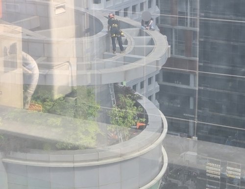 이 남성은 곧 떨어질 듯 옥상 가장자리에 있었다. 이에 소방 당국은 빌딩 앞 지상에 에어매트 2개를 설치하고 시민 접근을 통제하는 등 만일의 사태에 대비했다.