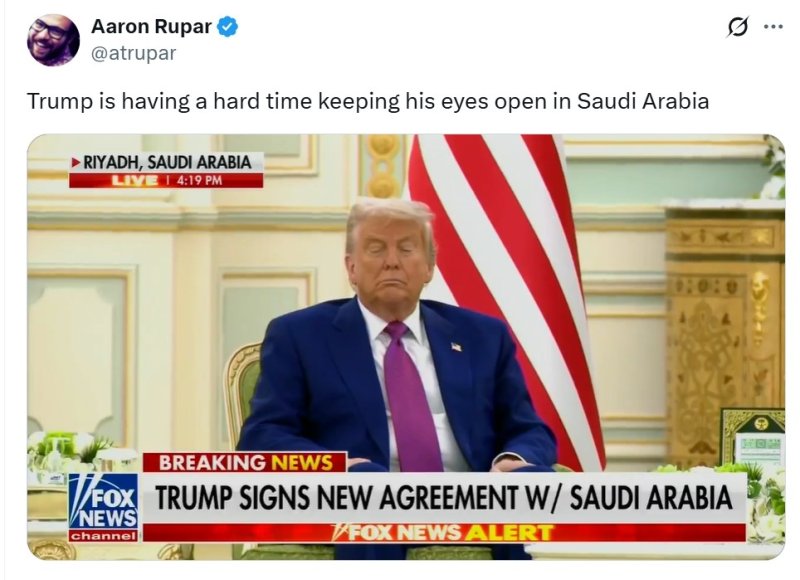 한 미국 언론인은 이 장면이 담긴 동영상을 엑스(X·옛 트위터)에 공유하면서 "트럼프가 사우디아라비아에서 눈을 뜨고 있기를 힘들어하고 있다"라고 썼다.