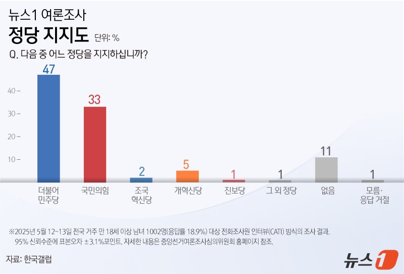 14일 한국갤럽이 뉴스1 의뢰로 지난 12~13일 이틀간 전국 만 18세 이상 남녀 1002명을 대상으로 실시한 정당 지지도 조사 결과에 따르면 민주당 지지율은 47%, 국민의힘 지지율은 33%로 집계됐다. 개혁신당은 5%였다. '지지 정당이 없다'는 응답은 11%다.