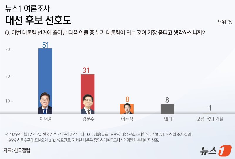 뉴스1이 여론조사업체 한국갤럽에 의뢰해 지난 12~13일 전국 18세 이상 남녀 1002명을 대상으로 조사해 14일 발표한 다자 대결 구도에서 이재명 후보는 51%를 기록했고, 김문수 후보 31%, 이준석 후보 8%로 뒤를 이었다.