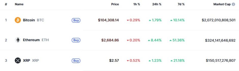 14일 오전 7시 현재 글로벌 코인 시황 중계사이트인 코인마켓캡에서 비트코인은 24시간 전보다 1.79% 상승한 10만4308달러를 기록하고 있다.