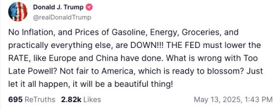 그는 13일(현지시간) 자신의 '트루스 소셜'에 올린 글을 통해 다시 한번 제롬 파월 연준 의장이 금리를 빨리 인하해야 한다고 주장했다.