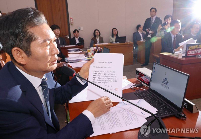 정 위원장은 대법관들의 불출석 사유서를 취재진을 향해 들어 보였는데, 이를 두고 국민의힘 의원들은 반발하기도 했다.