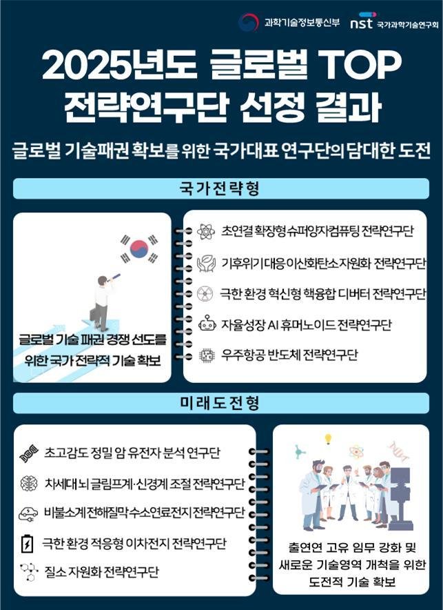 국가전략형에는 △초연결 확장형 슈퍼양자컴퓨팅 전략연구단(총 750억 원·연 150억 원) △기후위기 대응 이산화탄소 자원화 전략연구단(총 1000억 원·연 200억 원) △극한 환경 혁신형 핵융합 디버터 전략연구단(총 1000억 원·연 200억 원) △자율성장 AI 휴머노이드 전략연구단(총 1010억 원·연 210억 원) △우주항공 반도체 전략연구단(총 1010억 원·연 210억 원)이 선정됐다.