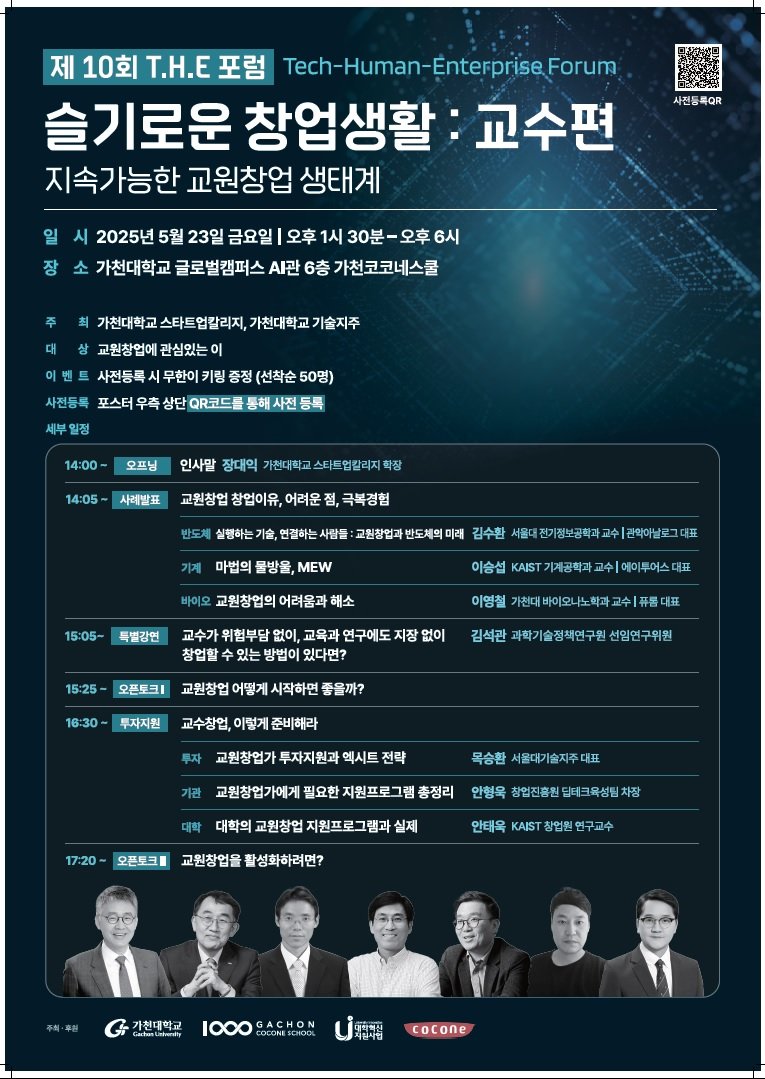 '슬기로운 창업생활: 교수편, 지속가능한 교원창업 생태계'를 주제로 열리는 이번 포럼은 가천대 스타트업칼리지와 기술지주회사가 공동 주최한다. 실제 창업 경험이 있는 교수들과 창업 지원 기관 전문가들이 참여해 교원 창업의 현실과 제도적 과제를 공유하고, 지속 가능한 생태계 조성을 위한 방안을 논의하는 자리다.