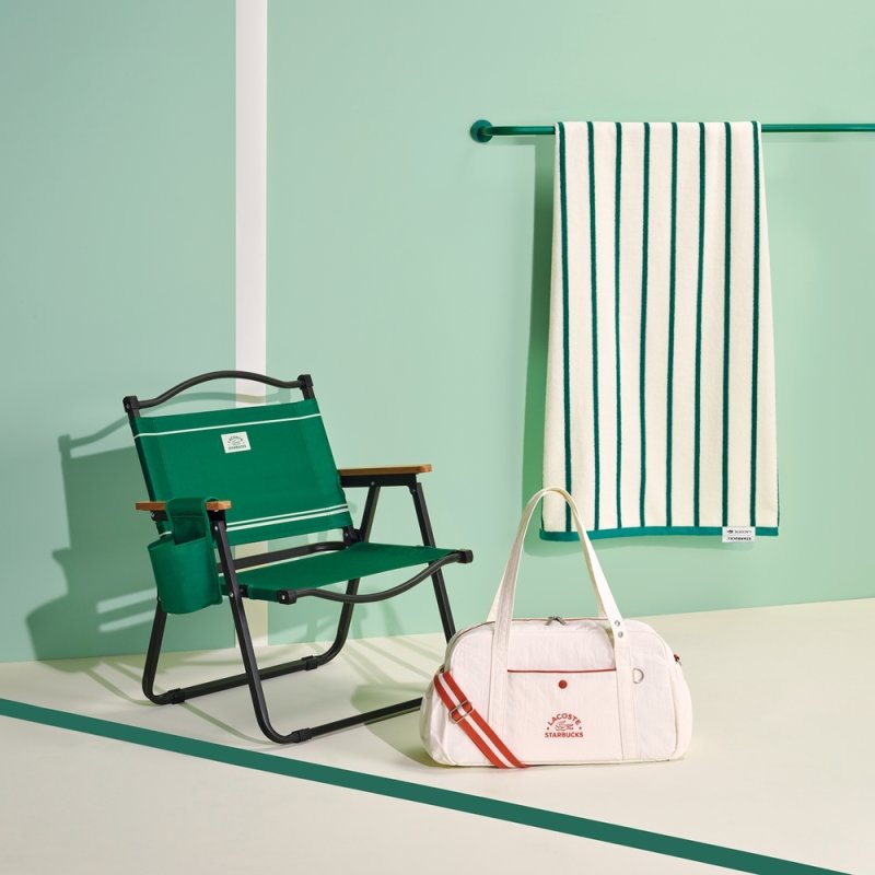 올여름 e-프리퀀시 증정품은 '와이드 폴딩 체어'(체어'(그린, 아이보리), '와이드 폴딩 체어 사이드 포켓'(그린, 아이보리), '멀티플백'(그린, 아이보리), '트렌타월'(그린, 아이보리, 스트라이프, 테라코타) 등 스타벅스와 라코스테의 그린 에너지를 담아 두 브랜드의 상징성을 강조한 실용적인 10종으로 구성됐다.