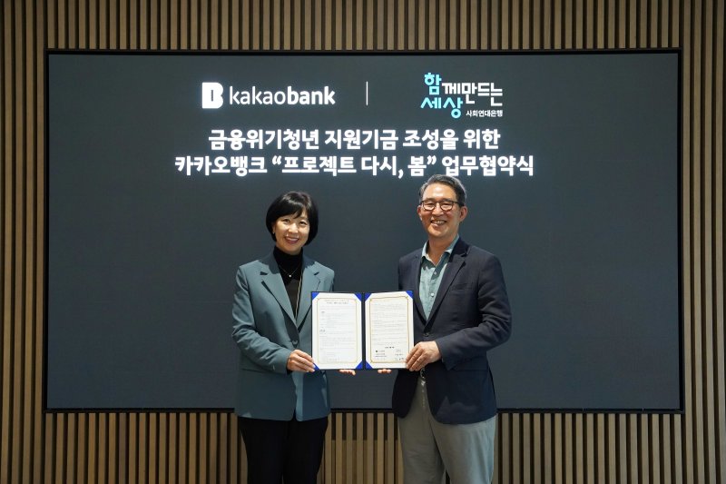 [서울=뉴시스] 이정필 기자 = 카카오뱅크는 ㈔함께만드는세상(사회연대은행)과 업무협약을 맺고 금융위기 청년 지원 기금조성을 위한 기부금 10억원을 전달했다고 15일 밝혔다.