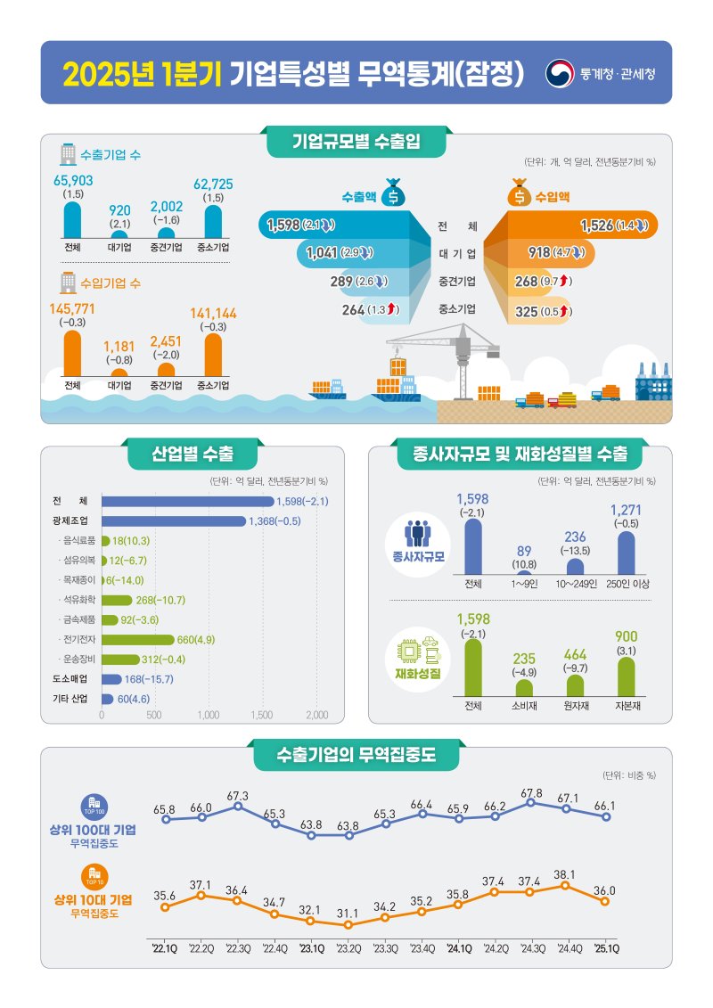 15일 통계청이 발표한 '2025년 1분기 기업특성별 무역통계(잠정) 결과'에 따르면 1분기 수출액은 1598억 달러로 전년보다 2.1% 감소했다.