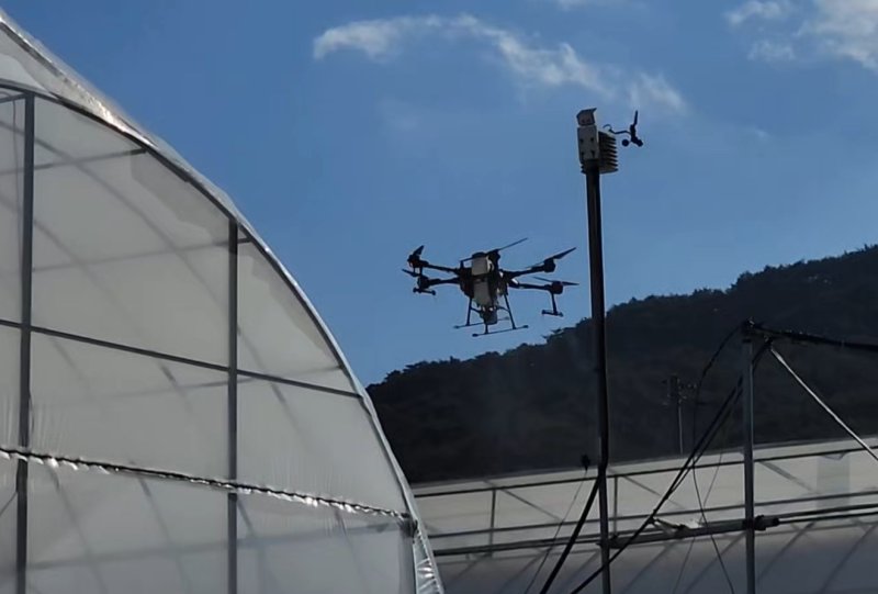 [경기광주=뉴시스] 신정훈 기자 = 경기 광주시농업기술센터가 15일 광주·오포 지역의 시설채소 재배 농업인을 대상으로 드론을 활용한 차광도포제 살포 현장 실증을 실시했다. 이번 실증은 여름철 이상고온으로 인한 작물 피해를 최소화하기 위한 신기술 적용의 일환이다.