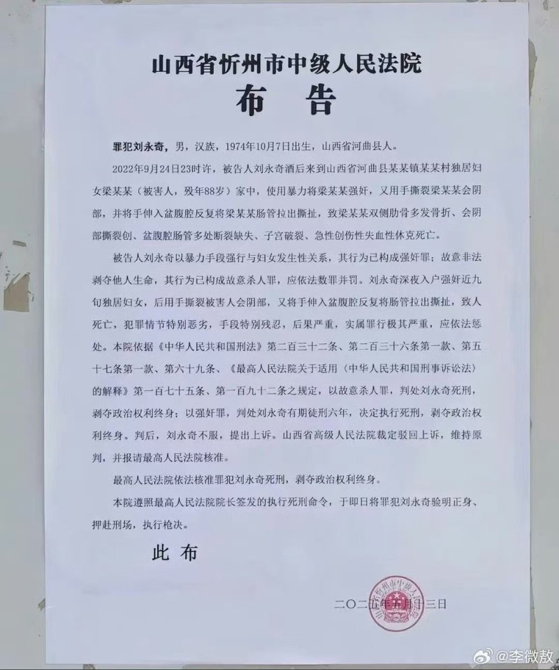 중국 산시성 신저우시 중급인민법원은 중화인민공화국 형법 제232조, 제61조, 제64조에 따라 고의살인 혐의로 사형이 선고된 산시성 허취현 출신 남성 류융치(51)에 대한 총살형을 지난 13일 집행했다고 밝혔다.