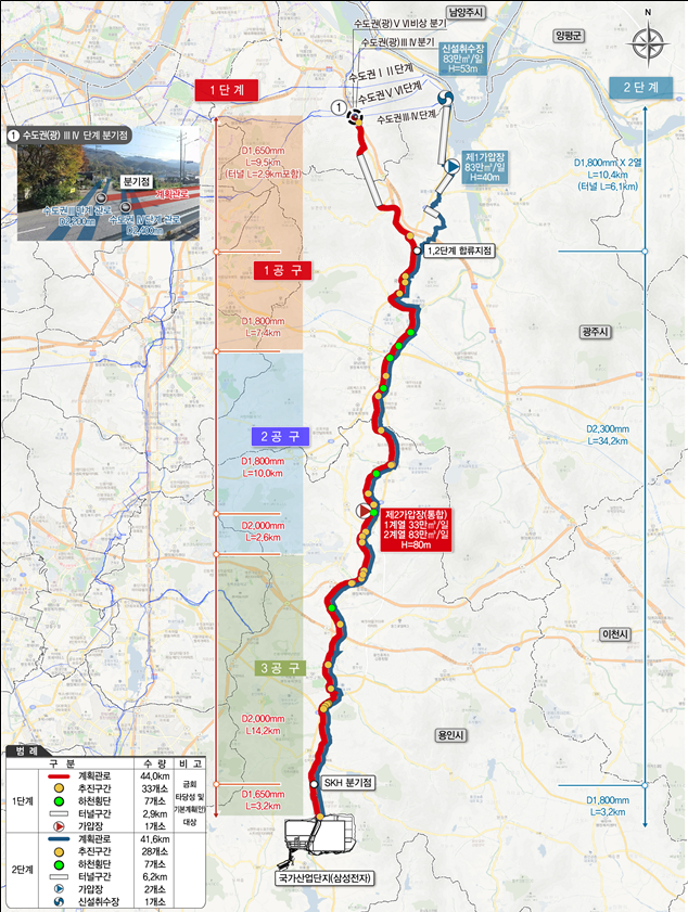 1단계 사업은 팔당댐에서 용인까지 총 46.9km의 전용관로와 가압장 1곳을 신설한다.